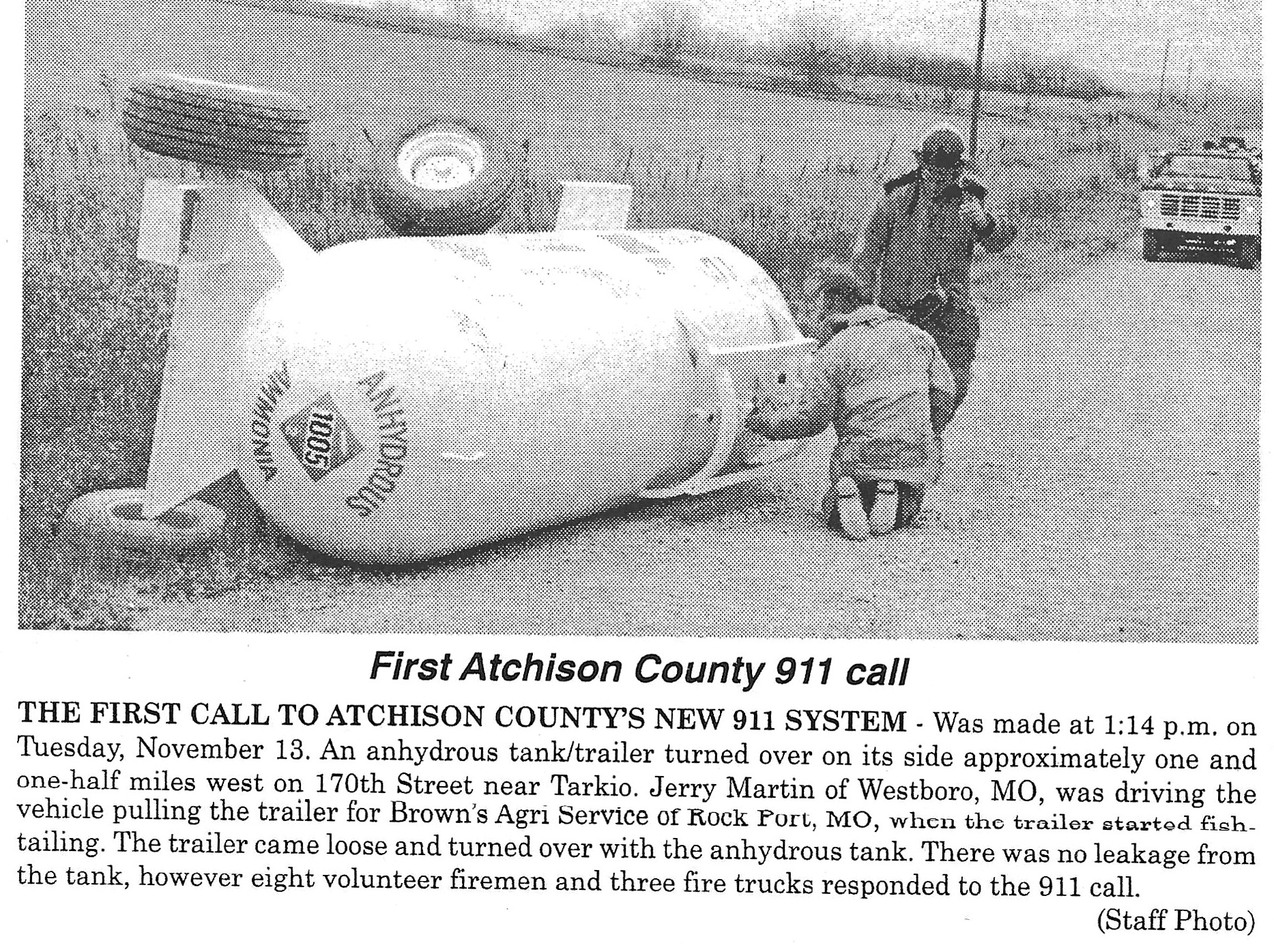 The first call to Atchison County’s new 911 system was made at 1:14 p.m. on Tuesday, November 13, 2001. An anhydrous tank/trailer turned over on its side approximately one and one-half miles west on 170th Street near Tarkio. Jerry Martin of Westboro, Missouri, was driving the vehicle pulling the trailer for Brown’s Agri Service of Rock Port, Missouri, when the trailer started fish-tailing. The trailer came loose and turned over with the anhydrous tank. There was no leakage from the tank, however eight volunteer firemen and three fire trucks responded to the 911 call. (Tarkio Avalanche photo)