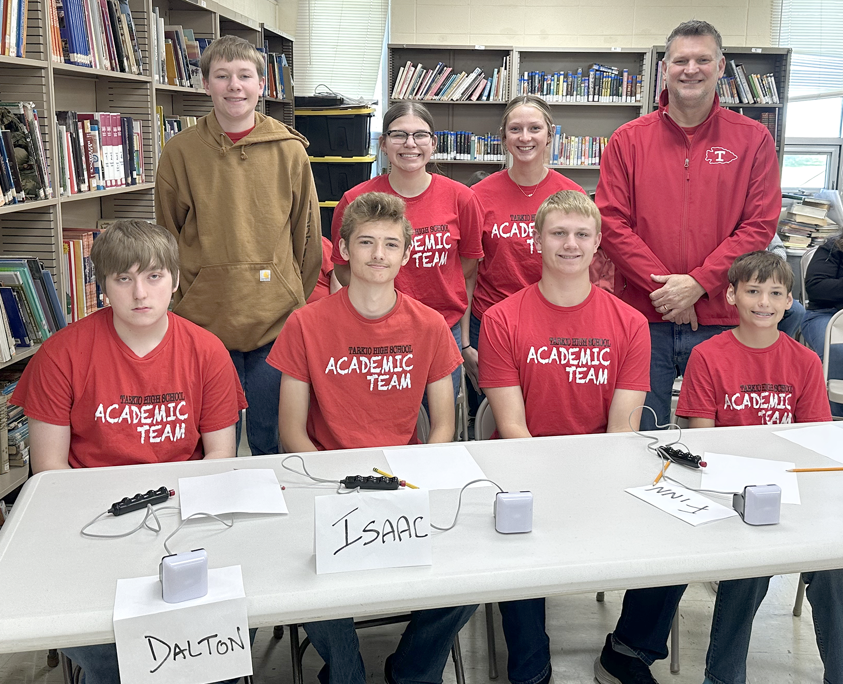 The Tarkio High School Scholar Bowl Team placed 4th in the District competition. They went 2-1 in the morning and advanced to the final 4 in the afternoon, but lost to the eventual champion North Andrew. Isaac Vette also earned All-District recognition. Pictured are team members, from left to right: front row – Dalton Hogue, Isaac Vette, Finn Hurst, and Owen Vette; and back row – Ben Rolf, Olivia Schaefer, Danika Agnew, and Coach Casey Martin. (Submitted photo)