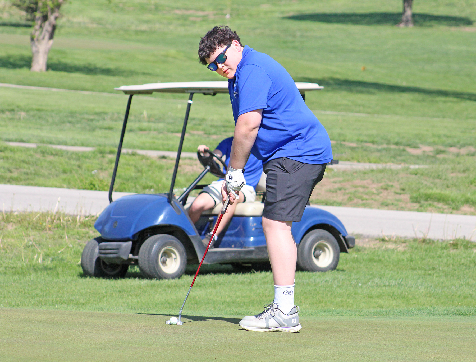 Brandon Athen lines up his putt on the first hole of the day in the Blue Jays’ home event April 21. He finished the day with a 48 for the JV.