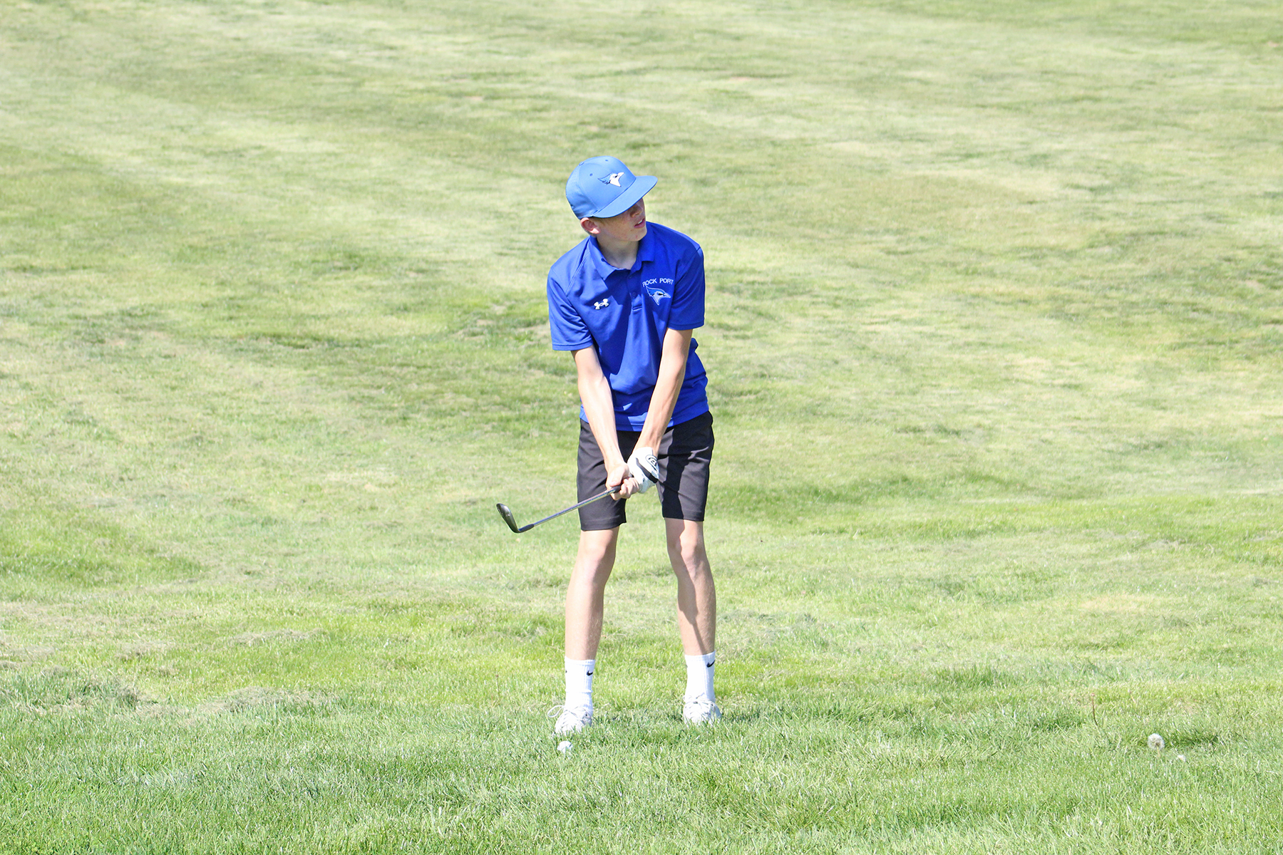 Tennyson Lansdown takes a swing at Rock Port’s home golf meet Tuesday, April 21. He scored a 45 for the JV Blue Jays.