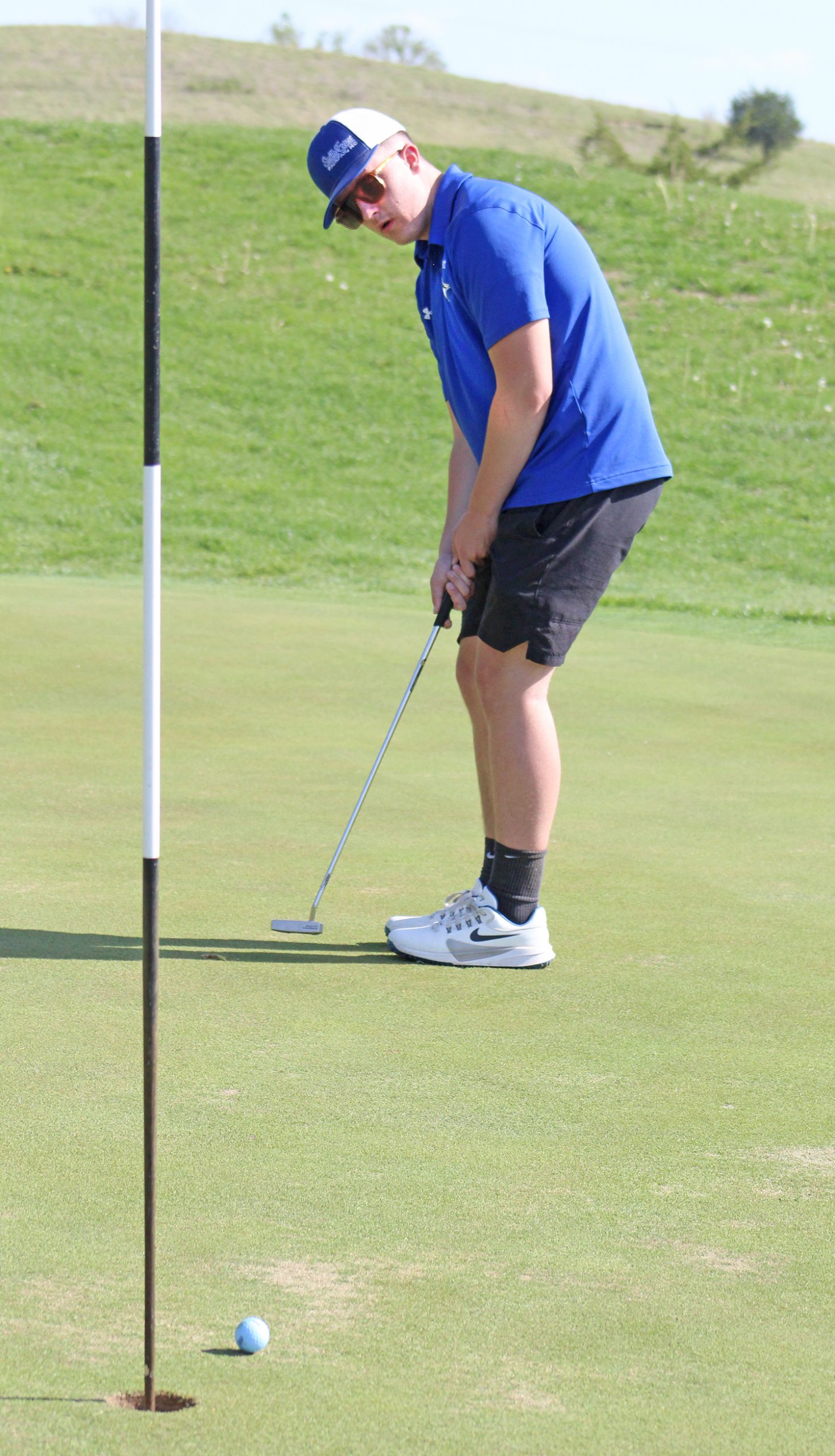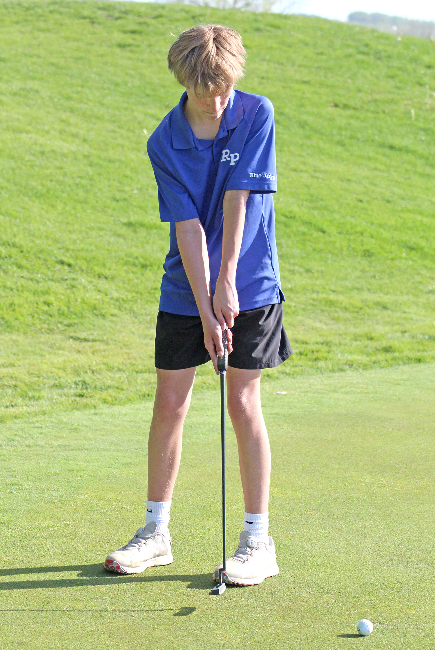 Blue Jay golfer Rush Lewis sends his putt toward the hole April 21.