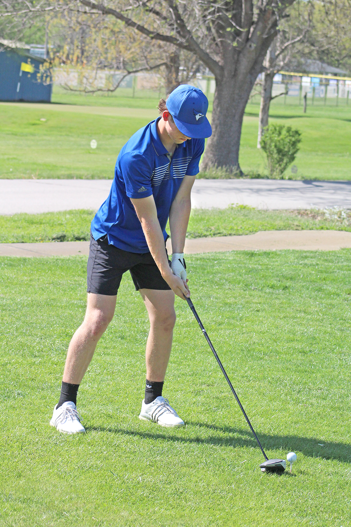Quentin Jackson tees off in the Blue Jays’ home golf meet at the Rock Port Golf Course.
