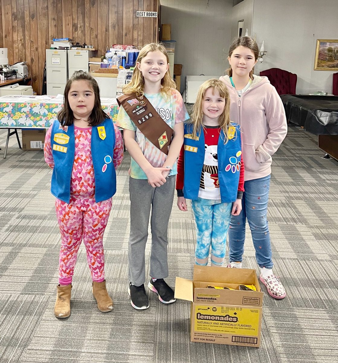 Tarkio Girl Scouts recently delivered cookies to the Tarkio Nutrition Center. The boxes were donated by the community through Girls Scouts Gift of Caring program and the troop. Pictured are Reagan Dorrel, Elizabeth Lundy, Cambria Baruth, and Saige Dorrel. (Natasha Baruth photo)
