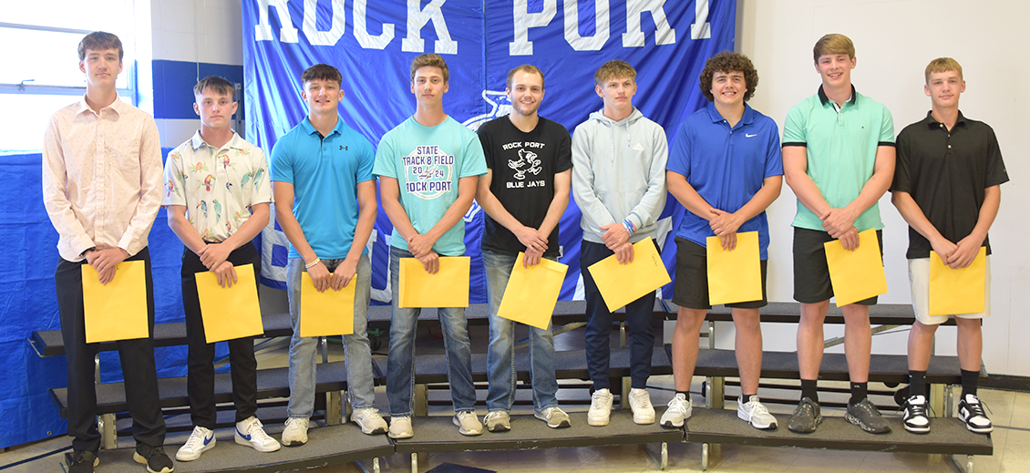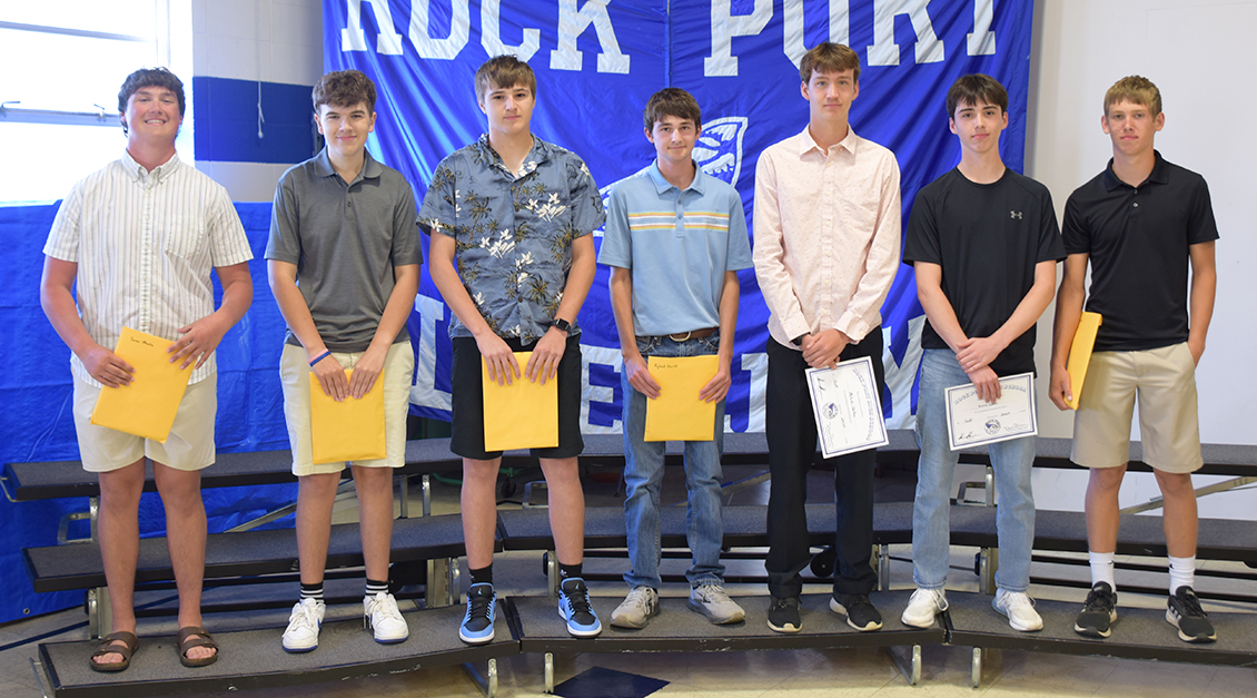 The Rock Port baseball team was recognized at the spring athletic banquet. Pictured, from left to right, are: Cade Makings, Zane Cook, Tayden Cook, Dylan Lair, Case Millsap, Westyn Amthor, and Kendan Melton. Not pictured are Ozey Hurst, Corbyn Jakub, Jadyn Geib, Logan Richards, Seth Gubser, Blayne Gubser, Corbin Wallace, Izac Hurst, and Chance Hayes.