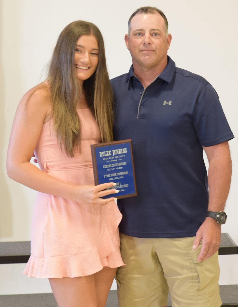 Coach Phil Vogler gave Rylee Jenkins a plaque in recognition of all of Rylee’s accomplishments throughout her career in track. Rylee holds the school record with a throw of 152’ 2.5”, was a three time state champion, and set a new state record this year with a throw of 146’3.25”.